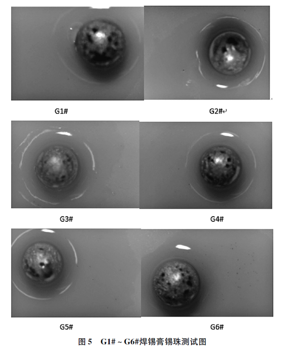 分析焊錫膏G1# ~ G6#所對(duì)應(yīng)的焊錫粉F1# ~F6#,其氧含量依次升高,F(xiàn)1#最低50 mg /kg,F(xiàn)6#最高130 mg /kg。由表1、表2 得出焊錫粉氧含量對(duì)焊錫膏粘度穩(wěn)定性有一定的影響,焊錫粉氧含量在80 ~ 120 mg /kg 時(shí)焊錫膏的穩(wěn)定性較好。按照IPC - TM - 650 2. 4. 43 的試驗(yàn)方法,以陶瓷片為載體對(duì)G1# ~ G6#進(jìn)行了錫珠試驗(yàn),試驗(yàn)結(jié)果如圖5所示。從圖5 看出G1#焊點(diǎn)周邊沒(méi)有小錫珠,G2#、G3#、G4#焊點(diǎn)周邊出現(xiàn)了小于5 個(gè)的小錫珠,G5#焊點(diǎn)周邊出現(xiàn)了大于10 個(gè)的小錫珠、G6 #焊點(diǎn)周邊出現(xiàn)無(wú)數(shù)錫珠。由此推斷當(dāng)氧含量超過(guò)120 mg /kg 時(shí),焊錫膏穩(wěn)定性雖好,但是焊點(diǎn)周圍產(chǎn)生大量小錫珠。