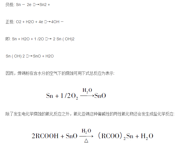 焊錫中除Sn 外還含有Ag、Cu ( 或其他元素)等相比較高電位的金屬,在有助焊劑介質(zhì)的作用下,形成無(wú)數(shù)個(gè)以Sn 為負(fù)極、Ag /Cu 等為正極的原電池,這就會(huì)發(fā)生如下反應(yīng):