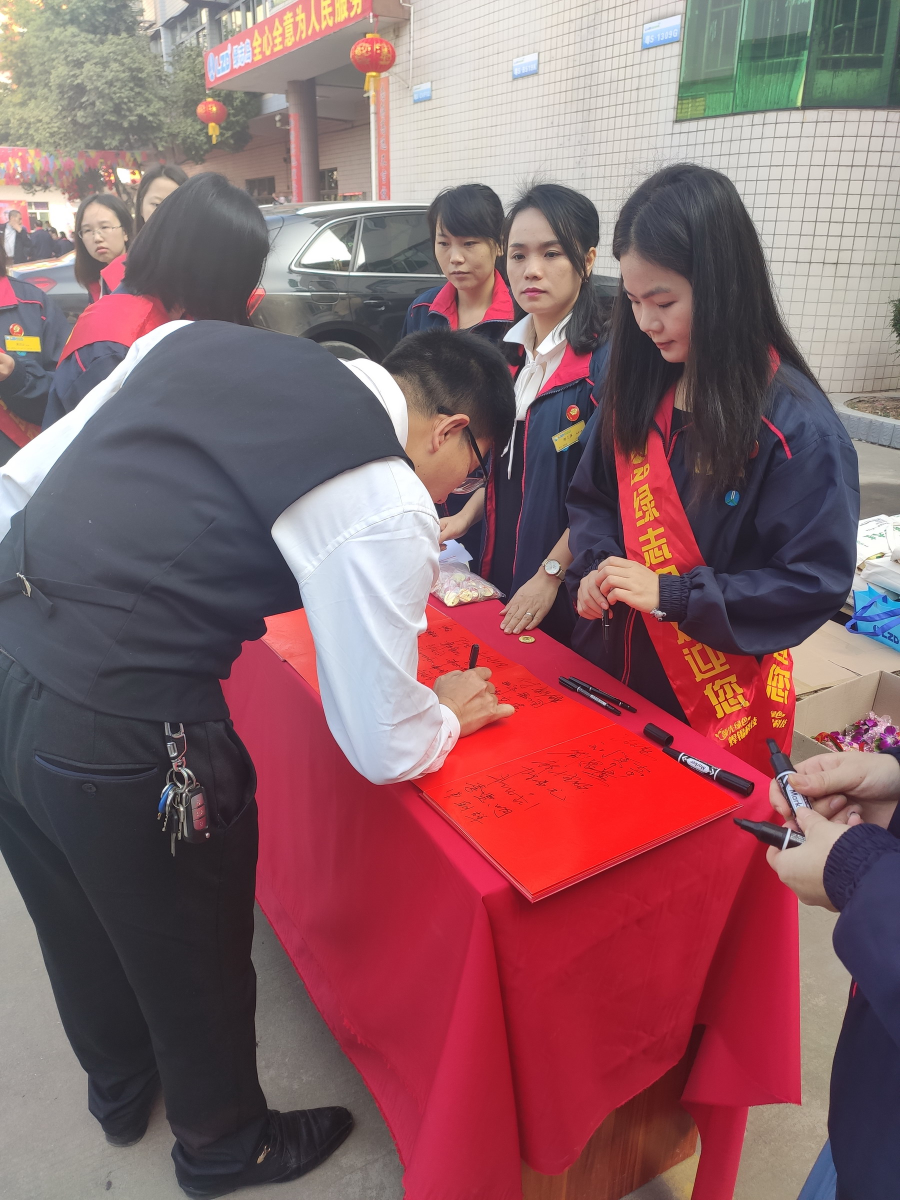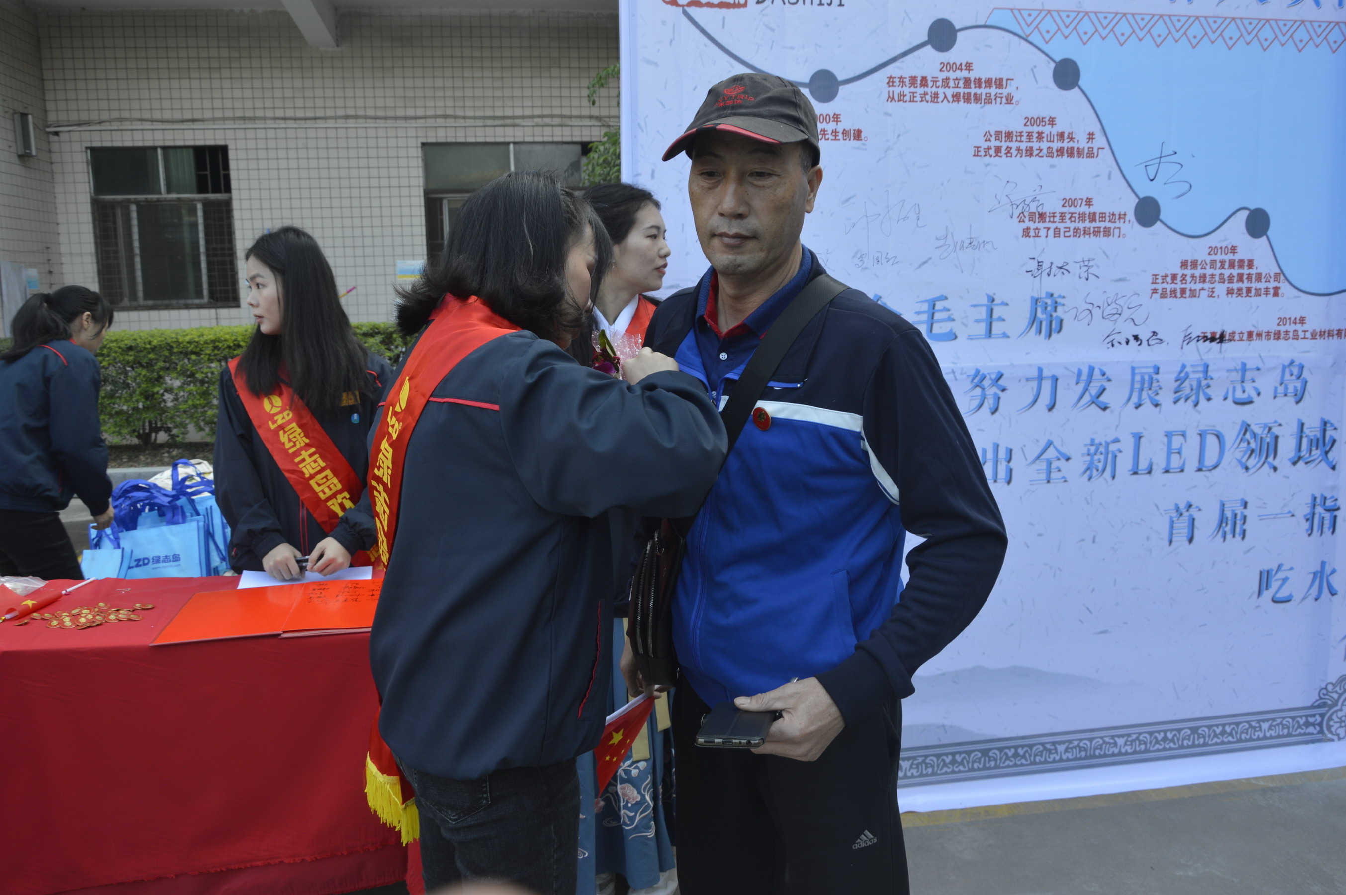迎賓人員為嘉賓佩戴毛主席像